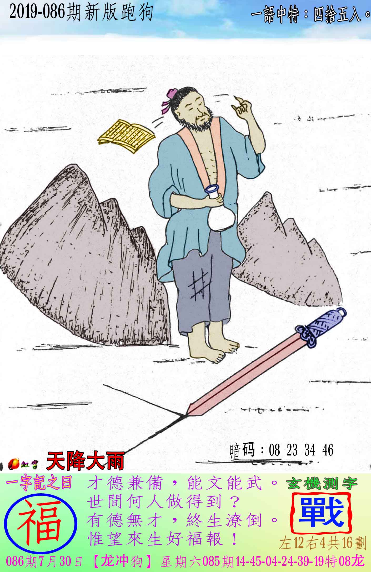 086期新版跑狗一字記之曰:【福】 才德兼備,能文能武。世間何人做得到? 有德無才,終生潦倒。惟望來生好福報! 玄機測字