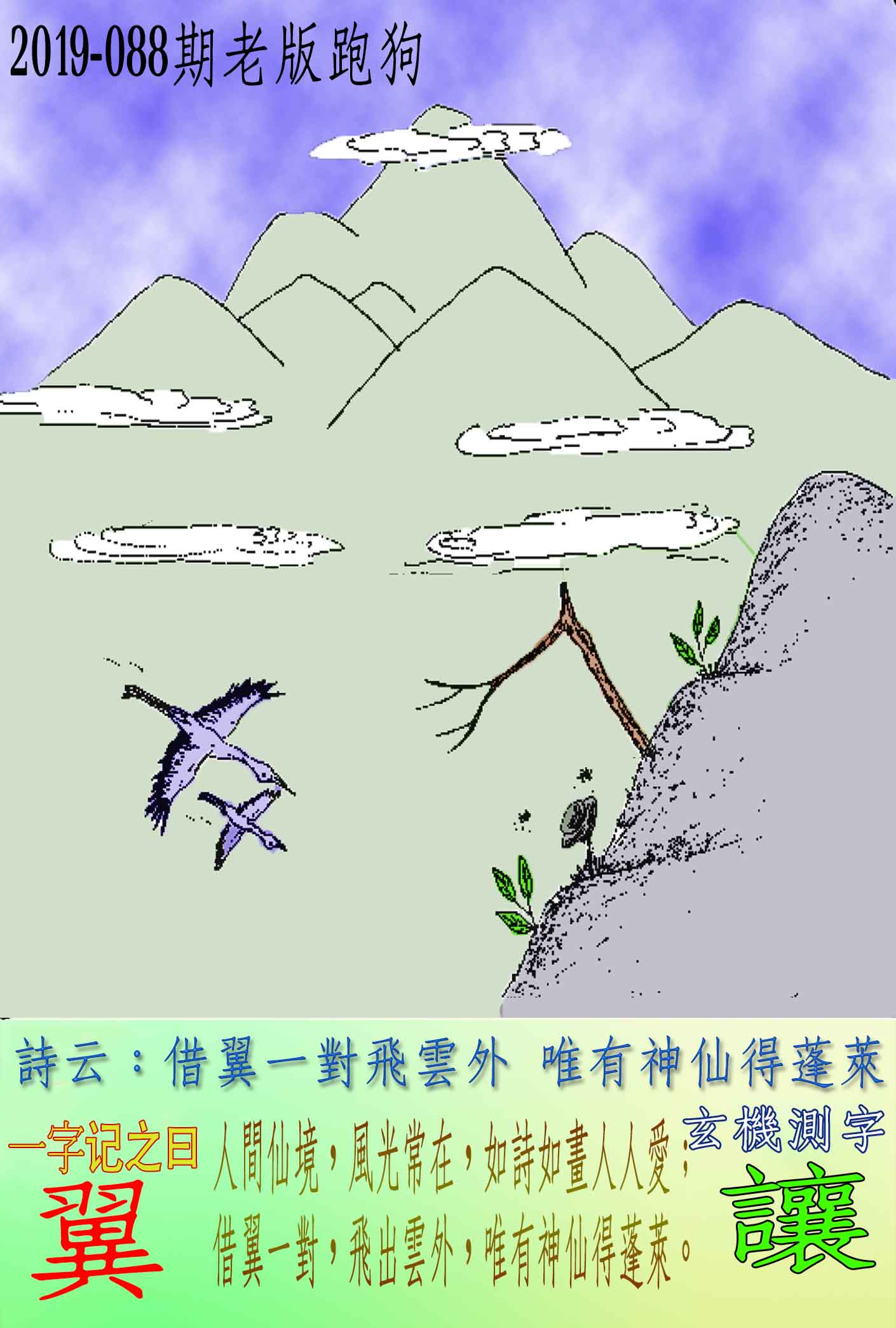 主题 : 088期老版跑狗一字記之曰:【翼】 詩云:借翼一對飛雲外 唯有神仙得蓬萊 人間仙境,風光常在,如詩如畫人人愛; 借