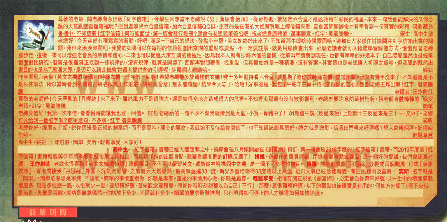 【1】尊敬的老總:聞老總有意出版「紅字信箱」,令學生回想當年老總說《男子漢總會抬頭》, 從那期起,就認定六合皇才是拯救萬千彩民的福星,本來一句話便能解決的又何必說的天花亂墜雲裡霧裡呢?便到處尋找六合皇信箱,加六合皇信箱QQ群,更甚的是在港的大姐幫買報上傳信箱來看,至創富網開辦後才有幸看到一份真實的彩報,現收藏於書櫃中,不知這冊「紅字信箱I何時能面世,第一版會 發行幾冊?應會有老總親筆簽名吧!祝老總身康體健,萬事勝意。紅字:暑氣騰騰。 學生:高中生敬