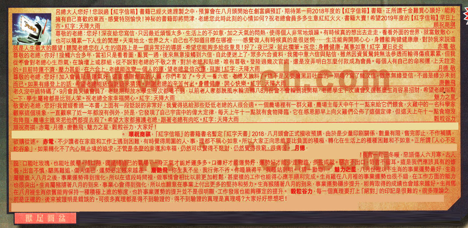 【1】呂總大人您好!您說過[紅字信箱]書籍已經火速趕裂之中,預算會在八月頭開始在創富綱預訂,期待第一冊2018年度的 [紅字信箱]書籍,正所謂千金難買心頭好,能夠擁有自己喜歡的東西,感覺特別愉快!神秘的書籍即將問津,老總您此時此刻的心情如何?祝老總會員多多生意紅紅火火,書籍大賣!希望2019年度的[紅字信箱]早日上市。红字:天降大雨 --- 順祝商祺