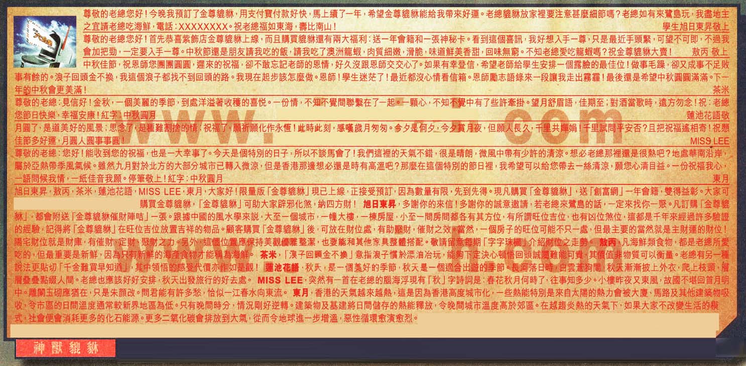 【4】尊敬的老總:見信好!金秋,一個美麗的季節,到處洋溢著收種的喜悦。一份情,不知不覺間聯緊在了一起。一顆心,不知不覺中有了些許牽掛。望月舒眉語,佳期至;對酒當歌時,遠方勿念!祝:老總您節日快樂,幸福安康!紅字:中秋圆月 --- 蓮池花語敬